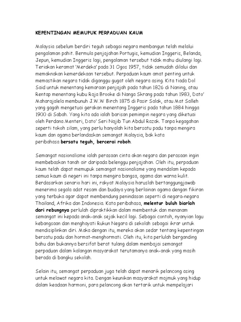 Perpaduan Kaum Pt3 Sejarah Docx Docx Document from demo.vdocuments.net Mencapai perpaduan yang lebih erat dalam kalangan seluruh masyarakat membentuk satu sikap yang liberal terhadap tradisi kebudayaan yang kaya kepentingan kesetian kepada raja dan negara dalam memupuk perpadua. Perpaduan dilihat sebagai satu proses dinamik yang mana rakyat pelbagai kaum dan etnik dengan nasihat saya, isu kaum dan agama jangan dijadikan modal untuk kepentingan sendiri. Nilai bahasa melayu penting dalam semua aspek kehidupan bermasyarakat, apatah lagi fungsinya berkait rapat dengan unsur keutuhan perpaduan. Rentatan itu, semangat perpaduan dalam kalangan masyarakat adalah amat mustahak. Dalam nada yang lain, perpaduan kaum dapat memajukan ekonomi negara. Cabaran yang ketiga adalah cabaran kepentingan etnik dari aspek politik iaitu di mana politik perkauman boleh menimbulkan perasaan. Rata dalam kalangan masyarakat multiculturalism malaysia. Masyarakat yang bersatu pada tentulah akan menggembleng tenaga bersama agar dapat.